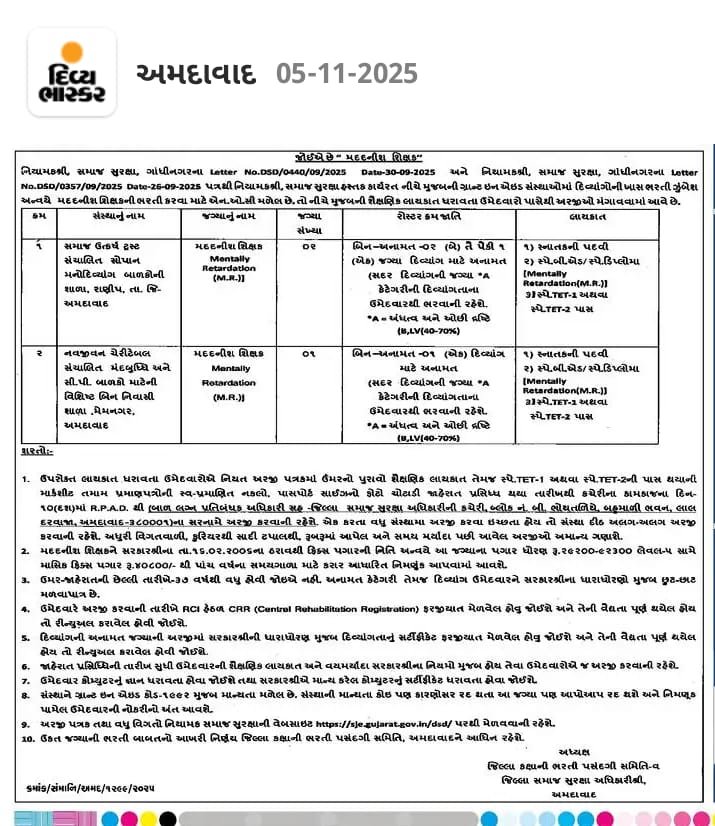 આ ભરતી અંતર્ગત સમાજ સુરક્ષા વિભાગ દ્વારા માનસિક મંદતા શિક્ષક (Special Educator – Mentally Retardation) ના પદો ભરવા માટે નવી જાહેરાત બહાર પાડવામાં આવી છે. આ ભરતીનો હેતુ દિવ્યાંગ બાળકોને ગુણવત્તાયુક્ત શિક્ષણ અને માર્ગદર્શન પૂરૂં પાડવા માટે યોગ્ય અને પ્રતિબદ્ધ શિક્ષકોની પસંદગી કરવામાં આવશે. જેમાં કુલ 3 ખાલી જગ્યાઓ માટે અરજી મંગાવવામાં આવી છે, જેમાં દિવ્યાંગ ઉમેદવારોને પ્રથમ પ્રાથમિકતા આપવામાં આવશે. આ તમામ જગ્યાઓ માટે પસંદ થયેલા ઉમેદવારોને શરૂઆતમાં ફિક્સ પગાર સાથે પાંચ વર્ષ માટે કરાર આધારિત નિમણૂક આપવામાં આવશે.